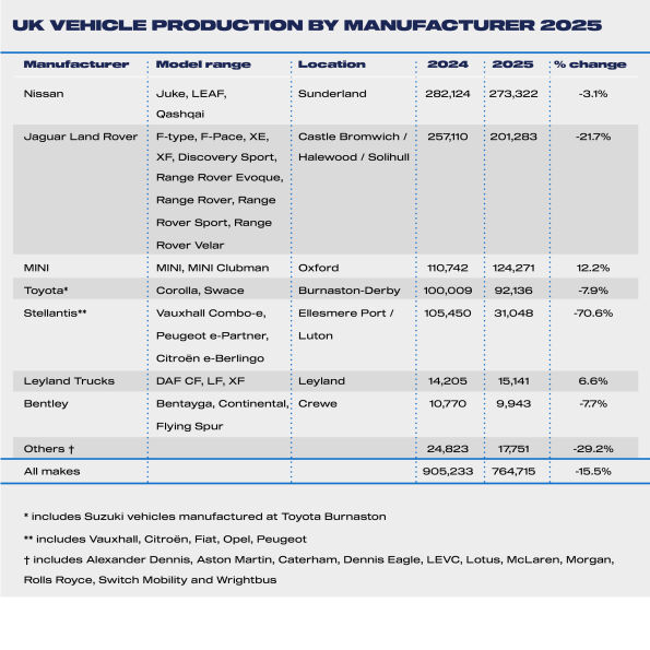 - Vehicle production down -15.5% in 2025 as 764,715 cars and commercial vehicles leave factories.