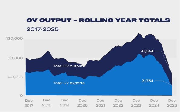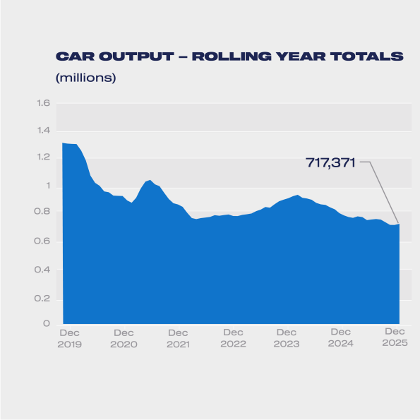Thursday 29 January, 2026 UK vehicle production fell -15.5% in 2025, according to the latest figures published today by the Society of Motor Manufacturers and Traders (SMMT). Factories turned out a total of 764,715 units – 717,371 cars and 47,344 commercial vehicles, with output falling by -8.0% and -62.3% respectively.1 Volumes were constrained by a number of factors, including a cyber incident stopping production at Britain’s biggest automotive employer; new tariffs on trade across the Atlantic; the consolidation of two CV plants into one; and ongoing restructuring as plants shift to a decarbonised future.