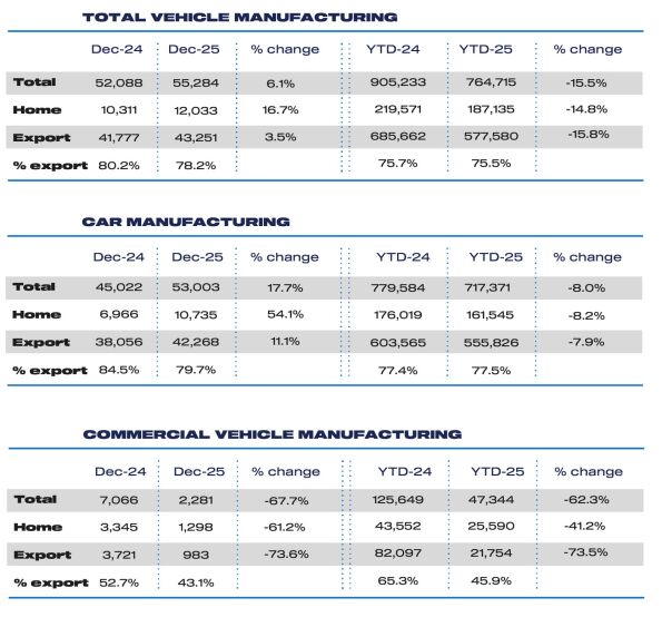- December car growth signals optimism for 2026, driven by new EV models entering production, with opportunity to produce one million vehicles by 2027 if conditions are right.