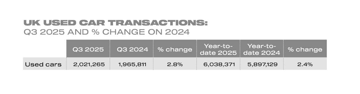 Monday 10 November, 2025 The UK’s used car market grew by 2.8% in the third quarter to reach more than two million (2,021,265) transactions, according to the latest figures published today by the Society of Motor Manufacturers and Traders (SMMT). It was the best third quarter since 2021, and marks an 11-quarter growth streak, driven by recovery in the new car market enabling a healthy supply of stock.1